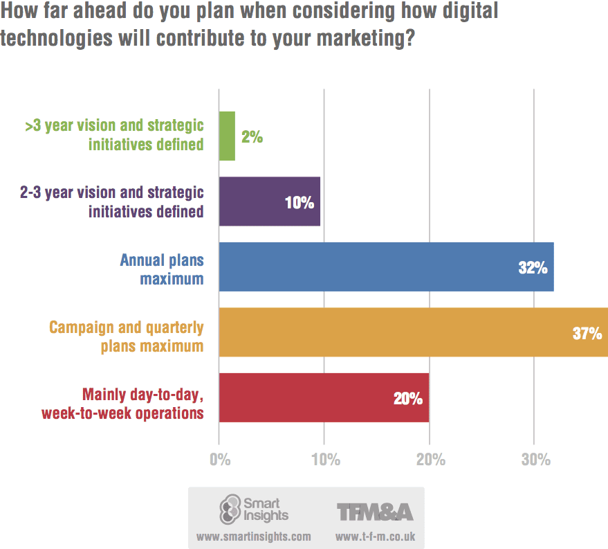 According to Smart Insights, business owners are under extreme pressure. Few feel they have time to move beyond short term execution-mode. Fewer than 2% of businesses have defined long term (more than three years) vision and strategic initiatives. The majority set goals only for campaigns or quarters, not the long term.